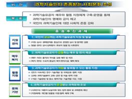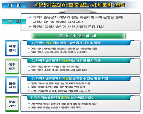 과기정통부는 「과학기술유공자 예우 및 지원에 관한 법률」에 따라 국가 과학기술 발전에 이바지한 공적이 큰 과학기술인을 과학기술유공자로 지정, 예우·지원하고 있다.