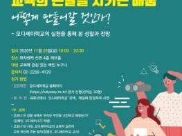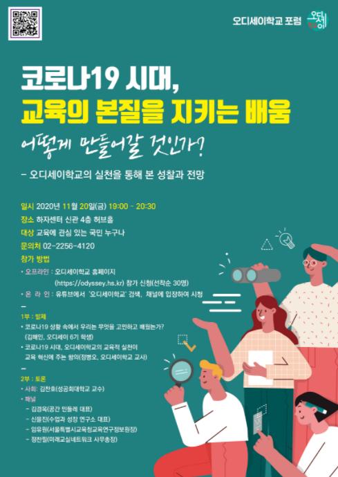 [한국4차산업신문] 서울특별시교육청 관내 오디세이학교는 11월 20일(금) 19:00~20:30에 “코로나19 시대, 교육의 본질을 지키는 배움 어떻게 만들어갈 것인가? - 오디세이학교의 실천을 통해 본 성찰과 전망”이라는 주제로 포럼을 개최한다.