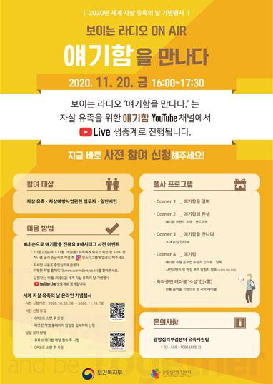 코로나 19 예방을 위해 유튜브 채널(얘.기.함.)을 통해 보이는 라디오 형식으로 진행된 이번 기념식에서는 자살 유족 인식개선 홍보(캠페인) ‘얘기함’을 공개하였다.