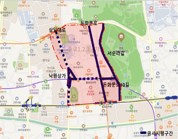 개선공사가 완료되는 4개 길(총 1.9km)은 ?돈화문로(창덕궁~종로3가역, 800m) ?서순라길(종묘 서측 담장 옆, 800m) ?삼일대로(낙원상가 하부, 160m) 3개의 남북축과, 이를 동서로 연결하는 ?돈화문10길(낙원상가~종묘, 140m)이다.