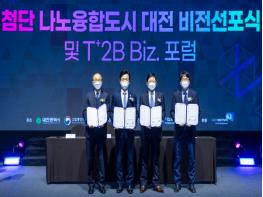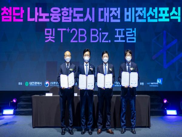 이날 대전시와 나노융합산업연구조합, 나노종합기술원, 한국과학기술원 나노융합연구소는 대전 나노융합산업 육성을 위한 업무협약을 체결했다.
