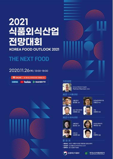 식품산업 세션에서는 △빅데이터 분석을 통한 2021 식품소비 행동 전망(서울대 문정훈 교수), △2021 식품산업 전망(KREI 이용선 박사) 등 내년도 식품산업 트렌드를 전망하고, 올해 해외매출 최대치를 기록할 것으로 예상되는 △농심의 해외진출 전략(농심 이용재 전무)과 IT 분야 글로벌 선두 기업인 구글의 △4차 산업혁명과 5G 시대 식품 비즈니스 전략(구글 조용민 매니저) 등 선도기업의 우수사례를 공유한다.