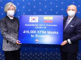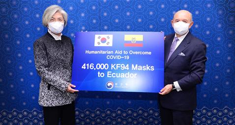 강 장관과 가예고스 장관은 면담이 끝나고 우리 정부가 코로나19 대응을 위해 에콰도르에 인도적 차원에서 지원하는 KF94 마스크 41.6만장 전달 기념사진을 촬영하였다.
