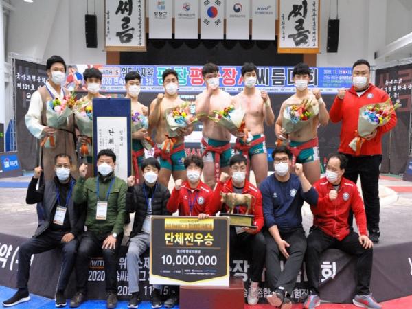 [한국4차산업신문] 영암군 민속씨름단은 지난 20일부터 24일까지 강원도 평창군 평창송어종합공연체험장에서 열린 민속리그 4차“2020 평창평화장사 씨름대회”에서 한라장사 등극과 단체전 우승을 거머쥐면서 씨름 강군으로서의 명성을 다시 한번 드높였다.