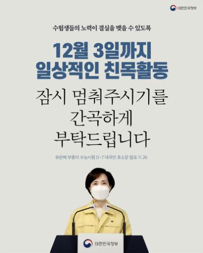 국민 모두가 수험생을 둔 학부모의 마음으로 모든 일상적인 친목활동을 잠시 멈춰주시기를 간곡하게 부탁드립니다.