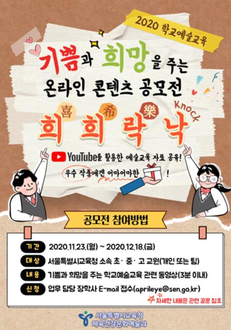 [한국4차산업신문] 서울특별시교육청은 학교예술교육 활성화를 위하여 학교예술교육 동영상 공모전 「희희락낙(樂knock)」 를 실시한다.