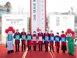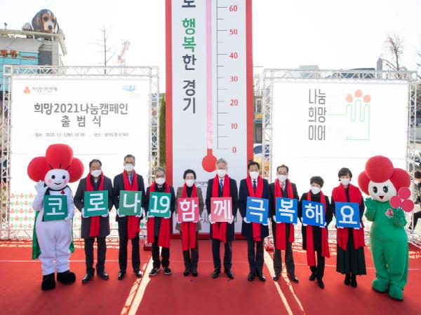 참석자들은 온도탑 가림막을 함께 제거하고 ‘나눔으로 따뜻한 경기도’, ‘코로나19 함께 극복해요’라는 내용의 카드섹션 퍼포먼스도 진행했다.