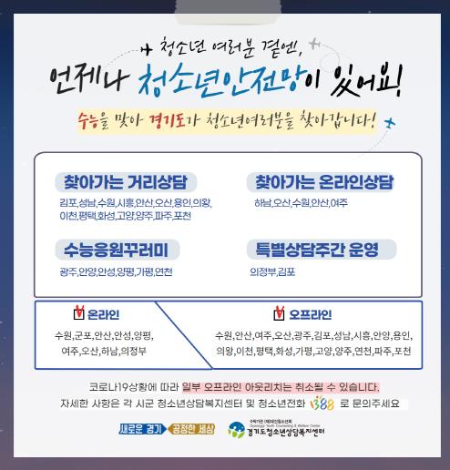 수원(수원역 로데오거리), 용인(처인구 역북지구 일대), 의왕(의왕역 부근), 파주(금릉역 로데오거리) 등에서는 수능이 끝나고 청소년들이 밀집하는 거리를 중심으로 코로나19 방역물품을 배포하거나 수능 합격을 기원하는 활동을 진행한다. 이를 통해 코로나 속 수능 준비로 지친 청소년을 격려하고 그로 인한 우울감을 가지고 있는 청소년 발굴하여 상담에 연계하고자 한다.