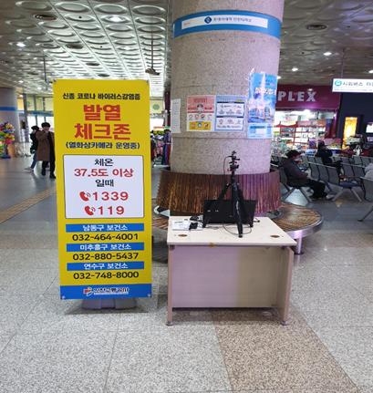 또한, 인천시는 군.구와 협의를 통해 열화상카메라를 추가로 확보하여 인천종합터미널, 지하역사 등에 추가 배치하고, 인천교통공사 및 미추홀구와의 협조체계를 통해 새벽부터 자정까지 터미널 방역 및 열감지 근무조(6개조 12명)를 편성 운영한다.