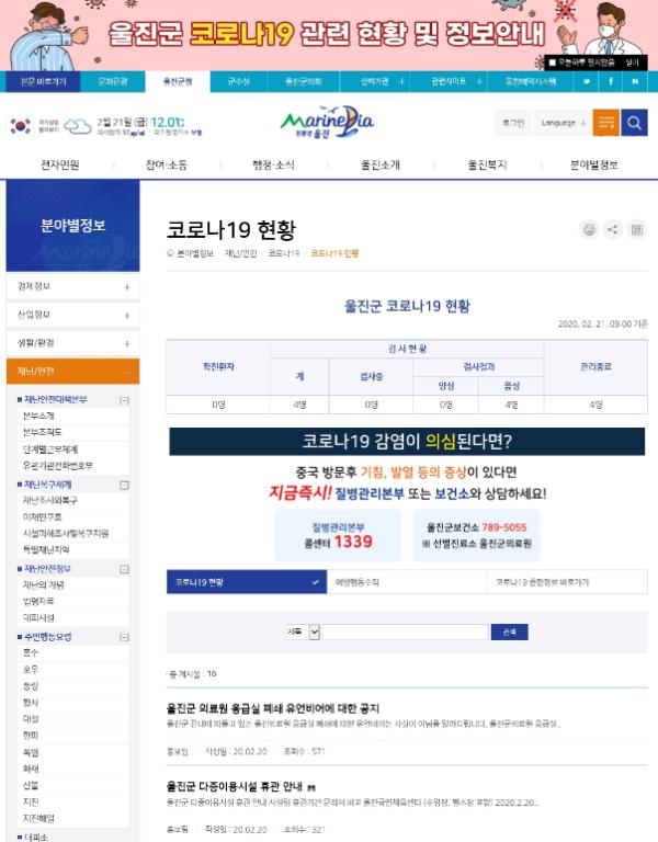 군청 홈페이지에 게시된 안내 사이트를 통해 울진군 코로나19 현황 및 관련 정보를 공개한다.