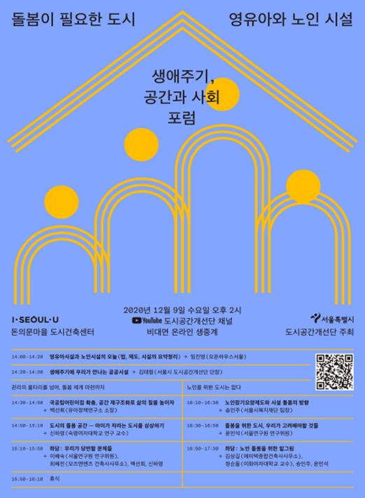 이번 포럼에서는 영유아 노인시설에 대한 정책 전문가와 연구자, 그리고 건축가가 한자리에 모여, 오늘의 돌봄 시설에 대해 현황과 이슈, 개선점에 대해 논의할 예정으로 코로나 19 감염 예방을 위해 비대면(언택트, untact) 방식으로 서울시 도시공간개선단 유튜브 채널을 통해 실시간 생중계된다.
