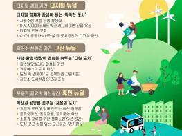 그린 뉴딜은 퍼스널 모빌리티 활성화 기반 조성, 공공건축물에 경기도 정책마켓 대상수상 정책인 ‘그린 커튼’설치, 제로에너지 도시환경 인프라 도입을 통해 사람?환경?성장이 조화를 이루는 ‘그린 도시’로 구상하고 있다.