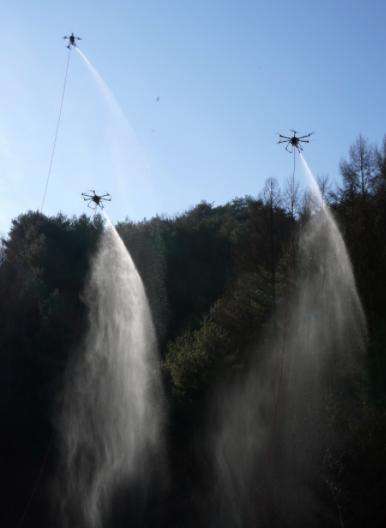 살수 드론은 산불 진화차와 연동하여 산림 주변부에 산불 진화약제를 살포하고 산불의 확산을 방지한다.