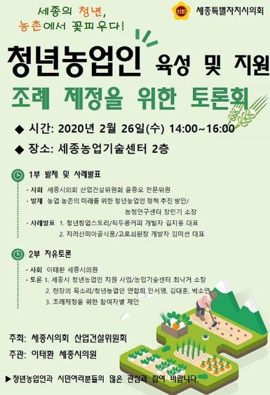 세종특별자치시의회 이태환 의원(조치원읍 신흥?신안?봉산?서창)은 오는 26일 오후 2시 조치원읍에 위치한 세종농업기술센터에서 ‘세종특별자치시 청년 농업인 육성 및 지원 조례’제정을 위한 토론회를 개최한다.