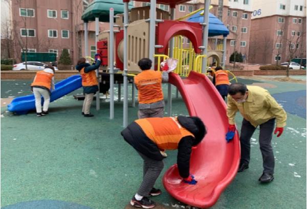평택시 청북읍 자원봉사 나눔센터(센터장 성수광)는 지난 19일 코로나19 확산 방지를 위해 어린이 놀이터 10개소 및 버스승강장 등 다중이용시설 방역활동을 실시했다.