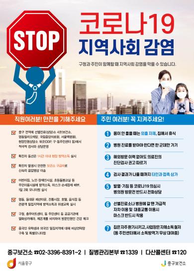 한편 구에서는 코로나19 위기는 주민들과 함께 극복해 나가야 함을 강조하며 구의 코로나 대응 방안과 개인예방수칙, 지역사회 감염 예방을 위한 내용이 담긴 홍보자료를 제작해 주민들에게 배포한다.