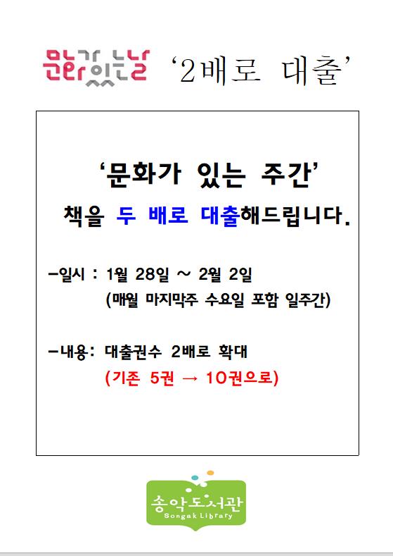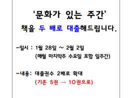 이번 ‘문화가 있는 주간행사로는 도서 이용확대를 위해 ‘도서대출 두 배로 데이’(5권→10권)를 운영하며, 매 월 마지막 주 수요일인 문화의 날 영화상영 행사는 신종 코로나 바이러스 확산 방지를 위하여 취소된다.