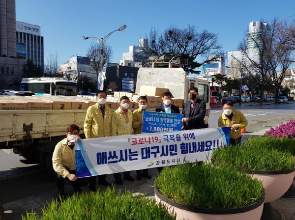 강원도는 2.23.(일) 최근 코로나-19 감염증 집단발병으로 어려움을 겪고 있는 대구광역시에 보호복 등 코로나19 의료용품 10,000여 세트를 대구광역시 최영호 정책기획관에게 전달하였다.