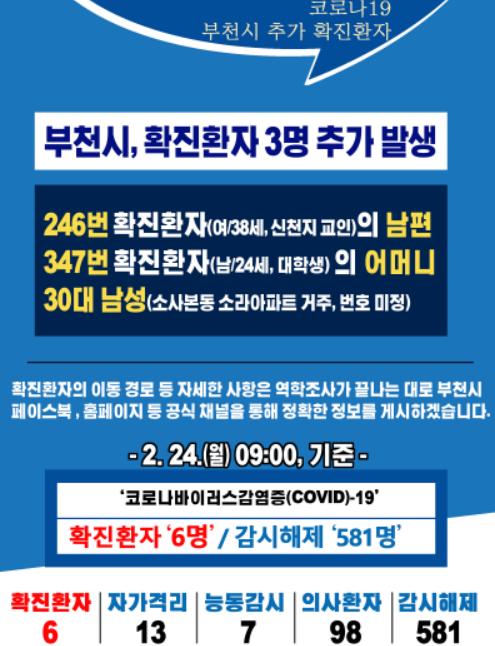 <부천시 확진환자 현황: 2월 24일 09:00 기준 6명>