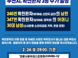 기존 확진환자의 접촉자로 자가격리 중이었던 246번 환자의 남편과 347번 환자의 모친이 검사 결과 양성 판정을 받고 각각 격리병원으로 이송됐다. 자택과 주변의 방역소독을 완료했다.