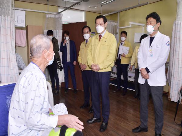 이용섭 광주광역시장은 24일 코로나19 격리해제로 진료를 재개한 광산구 21세기병원을 찾아 의료진과 입원환자들을 격려했다.