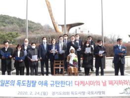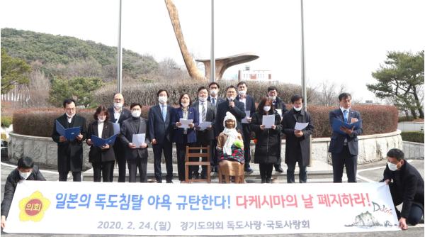 경기도의회 독도사랑·국토사랑회(회장 민경선의원, 고양4)는 24일 경기도의회 평화의 소녀상 앞에서 일본의 ‘다케시마의 날’폐지를 강력히 촉구하는 기자회견을 열었다. 이날 규탄대회에는 독도사랑·국토사랑회 회장 민경선의원을 비롯 고문인 안혜영(수원11) 배수문(과천) 김현삼(안산7)의원과 회원으로 고찬석(용인8) 김봉균(수원5) 김영해(평택3) 김용성(비례) 김은주(비례) 김중식(용인7) 유영호(용인6) 이종인(양평2) 장태환(의왕2) 황수영(수원6) 의원이 참석했다.