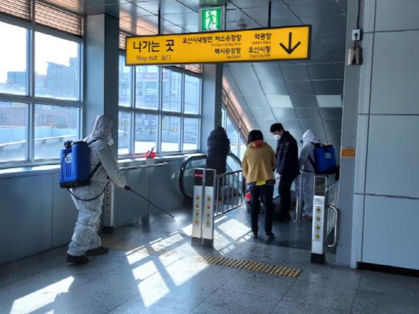 오산시지역자율방재단은 지난 24일 코로나19 확산 방지를 위해 오산역 환승센터 일원에서 자체 방역활동을 실시했다.