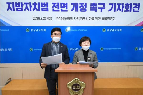 자치분권 강화를위한 특별위원회(위원장 김경영)(이하 특위)는 25일경남도의회 브리핑룸에서 지방자치법 전부개정을 촉구하는기자회견을 했다.