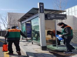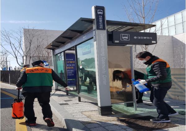 대전 대덕구 대화동자율방재단(단장 이정예, 이하 ‘방재단’)이 지난 24일 코로나19 확산 방지를 위해 관내 버스승강장에 대대적인 방역을 펼쳤다.