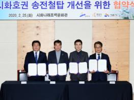 안산시(시장 윤화섭)와 화성·시흥시, K-water가 지난 25일 시화나래 조력문화관에서 ‘시화호 송전철탑 지중화 등 개선’을 위한 업무협약을 체결했다.