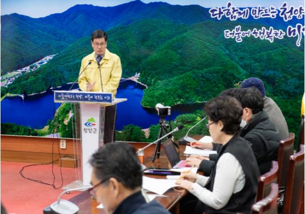 이날 군청 상황실에서 긴급 언론브리핑을 가진 김 군수는 국내 첫 확진자가 나온 지난달 21일 이후 현재까지 코로나19와 관련한 청양지역 상황을 설명하면서 향후 방역대책과 경기 부양책을 차례로 내놨다.