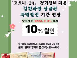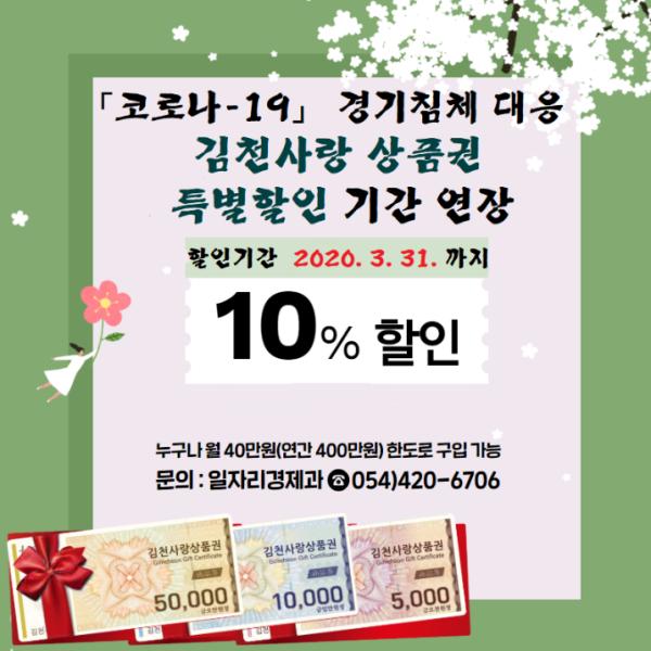 김천시는 코로나-19의 위기경보가 ‘심각’ 단계로 격상됨에 따라 침체된 지역경기 활성화의 일환으로 김천사랑 상품권 특별할인(10%) 기간을 3월 말까지 연장하여 실시하기로 했다.