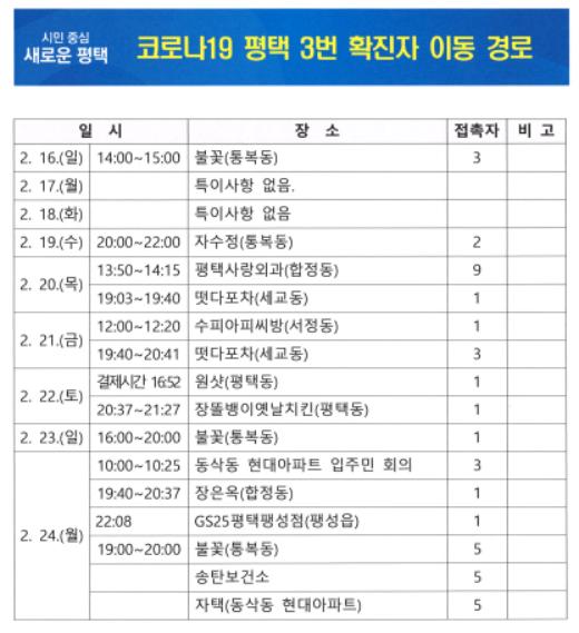 시는 송탄보건소를 포함, 확진자가 다녀간 장소에 대해 신속히 방역 소독을 실시했으며, 추가적으로 파악한 동선도 SNS 등을 통해 공개했다.