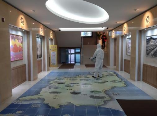 화순군(군수 구충곤)이 26일 코로나19 예방을 위해 군청과 군민회관 건물의 출입구, 복도 등을 소독하는 등 철저한 방역을 실시했다.