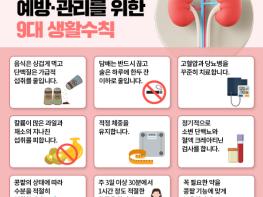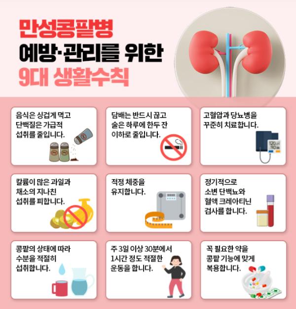 만성콩팥병을 예방하기 위해서는 원인 질환이 될 수 있는 병은 조기에 치료하고, 지나친 염분과 단백 섭취를 피하는 것이 좋다.