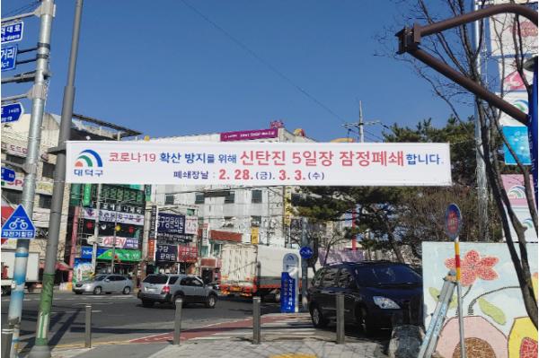 대전 대덕구(박정현 구청장)가 관내 거주자 중 코로나19 첫 확진자가 발생함에 따라 지역사회 확산 방지를 위해 28일과 3월 3일에 열리는 신탄진 5일장을 임시 폐쇄한다고 밝혔다.