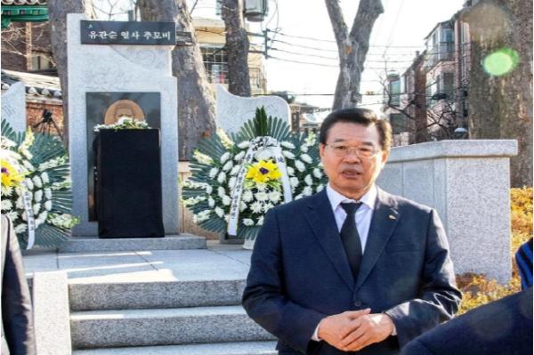 성장현 용산구청장이 27일 이태원부군당 역사공원(녹사평대로40다길 33)을 찾아 유관순 열사 추모비에 참배했다.