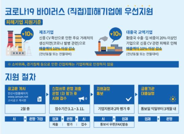 신청 기업 가운데 코로나19 피해기업에 해당되면 우선지원 자격을 부여받는다. 제조기업의 경우 코로나19 영향에 따른 거래처의 생산지연으로 전년도 또는 전월보다 매출액이 10% 이상 줄었을 경우 해당되며, 중국을 대상으로 한 수출·입 비중이 20% 이상인 교역기업도 마찬가지로 매출액이 10% 이상 감소했을 경우 지원기준에 포함된다.