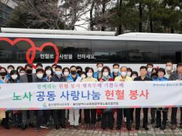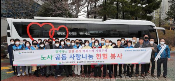 울산광역시교육청(교육감 노옥희)과 울산광역시교육청공무원노동조합연합은 26일 오전 10시부터 교육청 야외주차장에서 ‘노·사 공동 사랑나눔 헌혈봉사’를 실시했다.