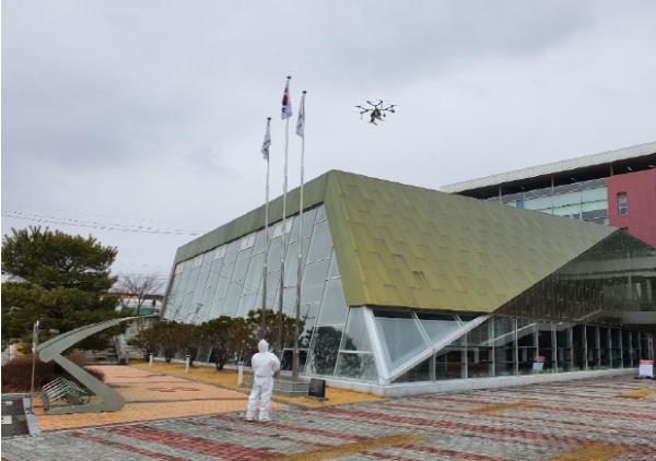 금일 방역은 관내 코로나19가 확산됨에 따라 지역 주민의 환자발생이 우려되는 상황속에서 ㈜무인항공연구소 직원 5명이 드론 2대에 방역약품을 장착하여 공중에서 분사하였으며,