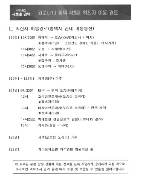 시는 확진자의 동선에 대해 19일 12시20분 평택역에서 포승읍 KM제약회사 택시로 이동, 19일 14시30분 포승읍에서 지제역 버스로 이동, 19일 15시56분 지제역에서 동대구역 SRT로 이동, 20일~23일 대구 자택, 24일 12시 대구에서 포승읍 호박공인중개사 자가용 이동, 13시 태광공인중개사, 14시25분 박애병원 선별진료소 방문 후 25일까지 포승읍 도곡리 자택에서 머무르다 26일 확진 판정을 받았다고 설명했다.