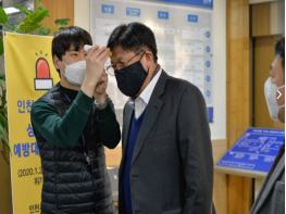 인천시교육청(교육감 도성훈)은 코로나19 예방과 확산방지를 위해 본청 직원을 포함한 출입자 발열 체크를 시작한 가운데, 27일(목) 도성훈 교육감이 청사 출입 전 체온을 확인하고 있다.