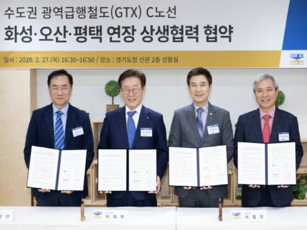 경기도와 화성시·평택시·오산시는 27일 경기도청 상황실에서 이재명 경기도지사와 서철모 화성시장, 정장선 평택시장, 곽상욱 오산시장 등이 참석한 가운데 광역급행철도(GTX) C노선 화성?오산?평택 연장을 위한 상생 협력 업무협약을 체결했다.