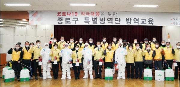 26일(수) 구청 한우리홀에서 발대식을 가진 ‘종로구 특별방역단’은 지역 내 방역 취약지역을 잘 아는 특별방역봉사단 60명과 시니어봉사단 10명 등 총 70명으로 구성됐다. 이들은 시설 실내외 방역소독방법, 살균제 사용방법, 주의사항 등의 안전교육을 마치고 본격적으로 활동에 들어간다.