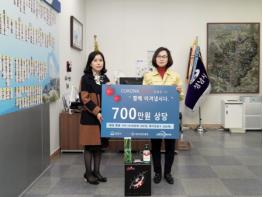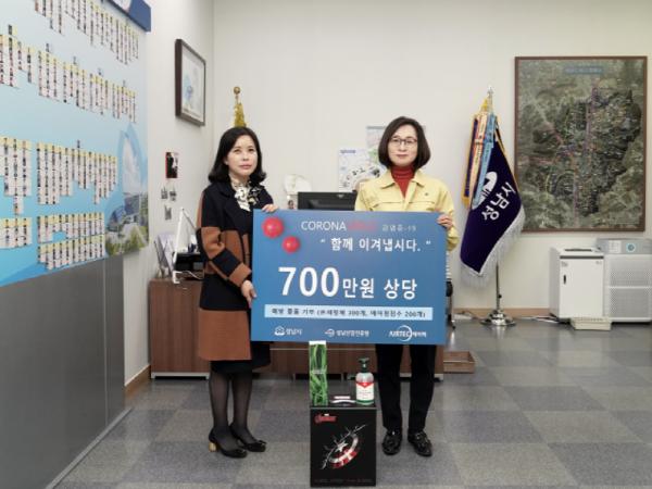 시는 이날 오전 10시 시장 집무실에서 은수미 성남시장과 박선영 ㈜에어텍 대표, 류해필 성남산업진흥원장 등이 참석한 가운데 ‘700만원 상당 코로나 19 예방 물품 기부식’을 했다.