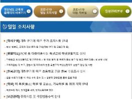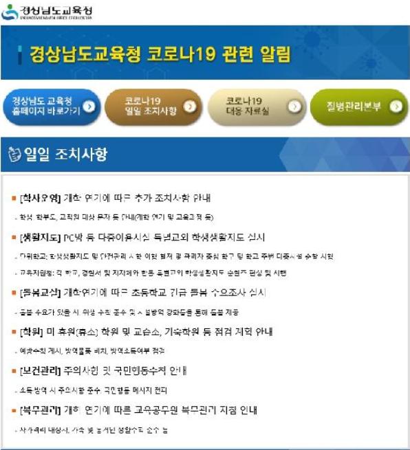코로나19 임시페이지는 일일 조치사항, 대응자료실, 질병관리본부 바로가기로 구성되어 있다. 일일 조치사항은 경남교육청에서 수행하는 코로나19와 관련한 하루하루의 대응책을 상세하게 제공한다.