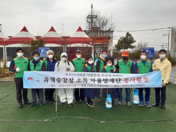 시와 전주시 자율방재단(단장 김동헌)은 28일 자율방재단원 30여 명이 참여한 가운데 신천지 교회 일대와 주변 버스승강장에 대한 집중 소독을 실시했다.