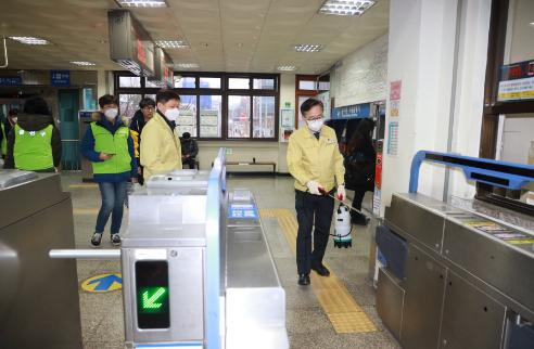 유성훈 구청장은 28일(금) 오전 8시부터 방역요원들과 함께 금천구민들이 가장 많이 이용하는 금천구청역 곳곳을 소독했다.