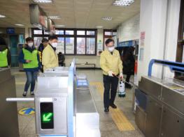 25일(화) 금천구에 코로나19 확진환자가 발생한 가운데, 유성훈 금천구청장이 금천구내 유동인구가 많은 지하철역사 방역에 나섰다.