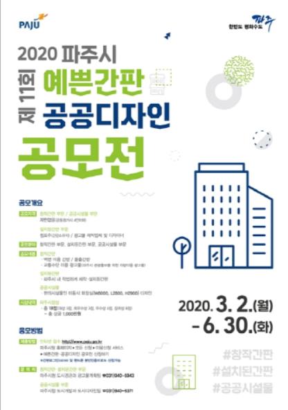 김찬호 파주시 도시경관과장은 “공모전을 통해 파주시의 특색이 담긴 창의적인 간판디자인을 발굴 및 개발해 파주시의 옥외광고물 수준향상과 올바른 광고문화 정착에 기여하는 계기가 되길 바란다”고 말했다.